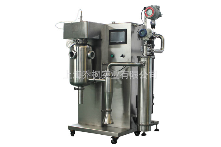 實驗型閉式噴霧干燥機采用菜單式微處理控制器,可以直接設置進口溫度、氣流量、自動通針頻率、蠕動泵速,實現(xiàn)數(shù)據(jù)采集以及過程監(jiān)控和控制。自吸蠕動泵將樣品液體從容器中通過噴嘴進入干燥腔,同時壓縮空氣從外層套管進入干燥腔使液體微粒化,熱空氣從上層進入與噴霧后的液體微粒相遇,物品開始干燥,干燥后的粉粒通過旋風分離器與廢氣分離后進入收集瓶中,廢氣則通過直徑軟管直接排到大氣或空氣過濾裝置。實驗型閉式噴霧干燥機主要適用于高校、研究所和食品醫(yī)藥化工企業(yè)實驗室生產(chǎn)微量顆粒粉末,對所有溶液如乳濁液、懸浮液具有廣譜適用性,實驗型閉式噴霧干燥機適用于對熱敏感性物的干燥如生物制品、生物農(nóng)藥、酶制劑等,因所噴出的物料只是在噴成霧狀大小顆粒時才受到高溫,故只是瞬間受熱,能保持這些活性材料在干燥后仍維持其活性成份不受破壞。