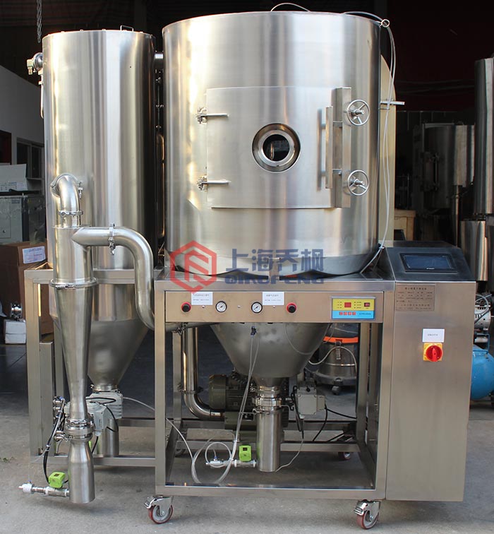 離心噴霧干燥機粘壁現象是妨礙噴霧干燥機正常操作的一個突出問題,固體制劑(特別是中藥)的噴霧干燥過程尤為明顯。物料粘壁不僅不利于收集操作,而且隨著時間的延長,敏感的粘壁物料會變質成為不合格物料。從工藝角度出發,解決手段包括選用合適的溶劑,增加輔料,改變工藝參數,但是這些方法可調節的余地不是很大,因此必須從設備的角度尋求根本的解決方案。國內外專家對干燥過程中的粘壁和結塊問題進行了研究,認為造成粘壁的主要原因是壁溫。