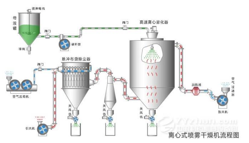 經(jīng)過過濾和加熱后,空氣進(jìn)入干燥機(jī)頂部的空氣分配器,熱空氣以螺旋狀均勻進(jìn)入干燥室。 物料液體通過塔身頂部的高速離心霧化器或高壓霧化器噴入非常細(xì)的霧狀液珠中,并且可以在很短的接觸時間內(nèi)干燥成成品 與空氣平行。 成品從干燥塔和旋風(fēng)分離器的底部連續(xù)輸出,細(xì)粉塵通過脈沖袋式集塵器收集,廢氣通過風(fēng)扇排出。