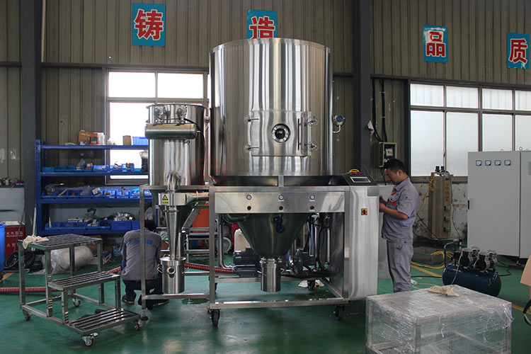 空氣經過濾和加熱,進入干燥器頂部空氣分配器,熱空氣呈螺旋狀均勻地進入干燥室。料液經塔體頂部的高速離心霧化器,(旋轉)噴霧成極細微的霧狀液珠,與熱空氣并流接觸在極短的時間內可干燥為成品。成品連續地由干燥塔底部和旋風分離器中輸出,廢氣由引風機排空。