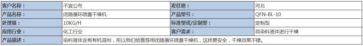物料屬于:染料液體含有有機(jī)溶劑,所以采用的是我們閉路循環(huán)噴霧干燥機(jī),這樣更安全,干燥效果不錯(cuò),閉路循環(huán)噴霧干燥機(jī)也可稱(chēng)為:有機(jī)溶劑噴霧干燥機(jī)或閉式循環(huán)噴霧干燥機(jī)等。