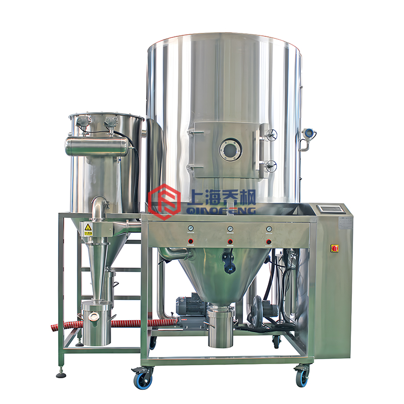 造粒噴霧干燥機是上海喬楓自主研發的一套造粒噴霧干燥機的。QFN-ZL系列造粒噴霧干燥機(喬楓)專門的雙氣送液造粒噴頭,國內一大創新,直接將均勻的球形霧滴通過均勻的熱量變成顆粒。